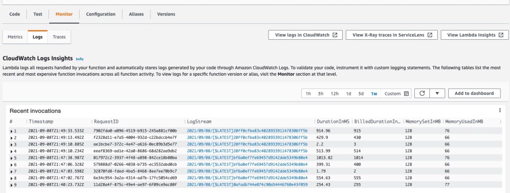 You can see these logs in your Lambda function by click on Monitor and then Logs. Each time your lambda function runs, a new log CloudWatch will be created. If your script has an error the traceback will appear here. if you put print or logging statement they will appear as a line in the log.